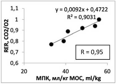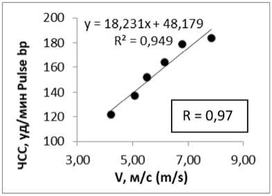 Можно отметить, что до порога анаэробного обмена четко прослеживается линейная зависимость ЧСС и МПК со скоростью передвижения. После ПАНО линейная зависимость между этими показателями уже не прослеживается. ЧСС более линейно реагирует на увеличение нагрузки и на увеличение анализируемых показателей газообмена, чем показатели лактата.