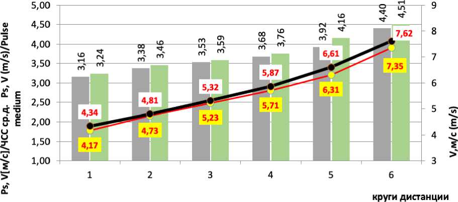 При увеличении скорости передвижения произошло и улучшение экономизации передвижения при этой скорости. Пульсовой кри- терий на последней максимальной ступени работы увеличился с 4,40 до 4,51 усл. ед. Это означает, что увеличение скорости произошло при меньших значениях ЧСС, что свидетельствует об эффекте экономизации. Скорость на последней ступени работы увеличилась с 7,35 до 7,62 м/с при темпе скорости на 1 км дистанции, равном 2 мин 16 с и 2 мин 11 с соответственно. Высокая скорость последнего круга в тесте была достигнута за счет более высокой активации гликоза во втором тесте (La соответственно составил 7,3 и 10,3 мМоль/л).