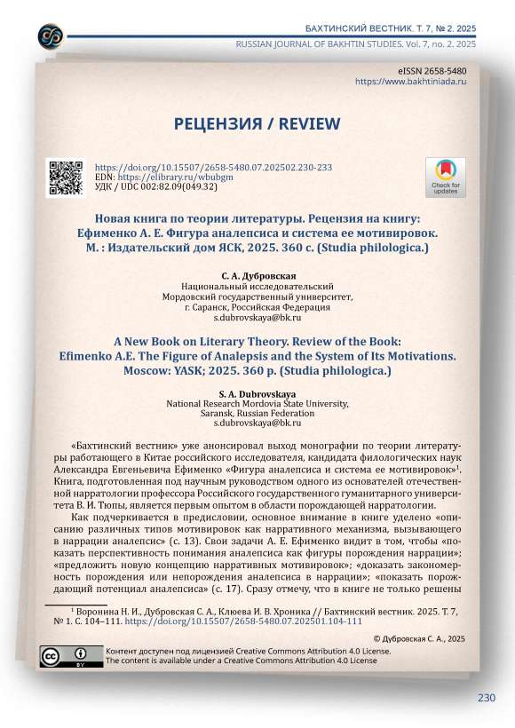 Новая книга по теории литературы. Рецензия на книгу: Ефименко А. Е. Фигура аналепсиса и система ее мотивировок. М. : Издательский дом ЯСК, 2025. 360 с. (Studia philologica.)