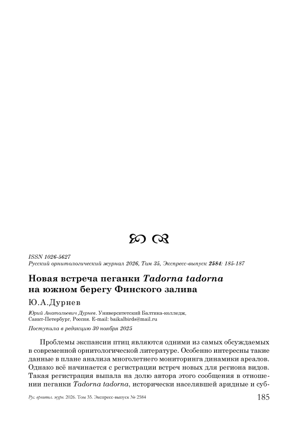 Текст статьи Новая встреча пеганки Tadorna tadorna на южном берегу Финского залива