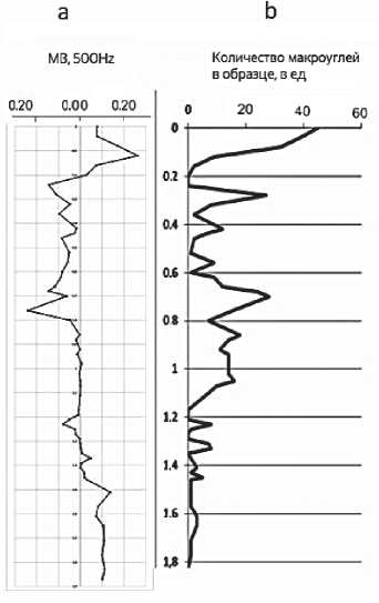 Рис. 2. Результаты комплексного анализа отложений торфяника Утиное Болото: a — значения магнитной восприимчивости; b — количество макроуглей в образце (в ед.); c — процентное содержание древесных пород и других групп растительности, а также сосны, лещины, папоротников и спор гриба Glomus и радиоуглеродный возраст (кал. л. н.)