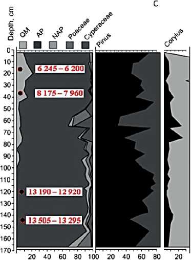 Образцы в самой нижней части разреза (до 13 900 ± ± 630 кал.) оказались бедны палиноморфами. Здесь же встречена переотложенная и корродированная пыльца, а также цисты динофлагеллат, которые не фиксируются далее вверх по разрезу. Количество пыльцы и спор существенно возрастает в отложениях, начиная с 13 900 ± 630 кал. С этого периода и до начала голоцена (11 500 ± 860 кал. л. н.), растительность характеризовалась доминированием сосны обыкновенной (Pinus sylvestris), при этом процент древесной растительности на большей части позднеледниковья составлял не менее 90 %, что близко к значениям, зафиксирован-