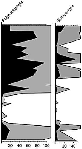 голоцена. Региональные (Wačnik, 2009; Fiłoc et al., 2024) и локальные (Druzhinina et al., 2015, 2023) данные свидетельствуют о противоположном тренде — об увеличении густоты и сомкнутости древесного покрова в раннем голоцене, что связывается с амелиорацией климата. По-видимому, палиноспектр Утиного Болота отражает не климатический, а антропогенный фактор в динамике древесного покрова. Сокращение доли древесных пород на исследуемой территории сопровождается и другими индикаторами антропогенной деятельности: усилением пожарной активности, фиксируемой в количестве макроуглей в образцах, и почвенной эрозии, о чем свидетельствуют первый голоценовый пик Glomus, а также пыльца подорожниковых. Вероятно, следствием увеличения разреженности лесов и участия пожаров в этом процессе является и значительное процентное содержание папоротников в составе спектра начиная с 11 500 ± 860 кал. л. н. Следствием описанных процессов может быть и распространение вторичных березовых лесов.