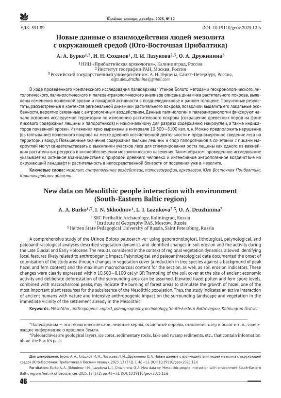 В ходе проведенного комплексного исследования палеоархива* Утиное Болото методами геохронологического, литологического, палинологического и палеоантракологического анализов описана динамика растительного покрова, выявлены изменения почвенной эрозии и пожарной активности в позднеледниковье и раннем голоцене. Полученные результаты, рассмотренные в контексте региональной динамики растительного покрова, позволили выделить его локальные особенности, вероятно связанные с антропогенным воздействием. Данные палинологии и палеоантракологии фиксируют начало освоения исследуемой территории по изменению растительного покрова (сокращение древесных пород на фоне пикового содержания лещины и папоротников) и максимальному для разреза содержанию макроуглей, а также индикаторов почвенной эрозии. Изменения ярко выражены в интервале 10 300—8100 кал. л. н. Можно предположить нарушение (вытаптывание) почвенного покрова на месте древней хозяйственной деятельности и преднамеренное сведение леса на территории вокруг. Повышенные значения содержания пыльцы лещины и спор папоротников в сочетании с пиками макроуглей могут свидетельствовать о выжигании участков леса для стимулирования роста лещины как одного из важнейших растительных ресурсов в жизнеобеспечении мезолитического населения. Таким образом, проведенное исследование указывает на активное взаимодействие с природой древнего человека и интенсивное антропогенное воздействие на окружающий ландшафт и растительность в непосредственной близости от поселения уже в мезолите.