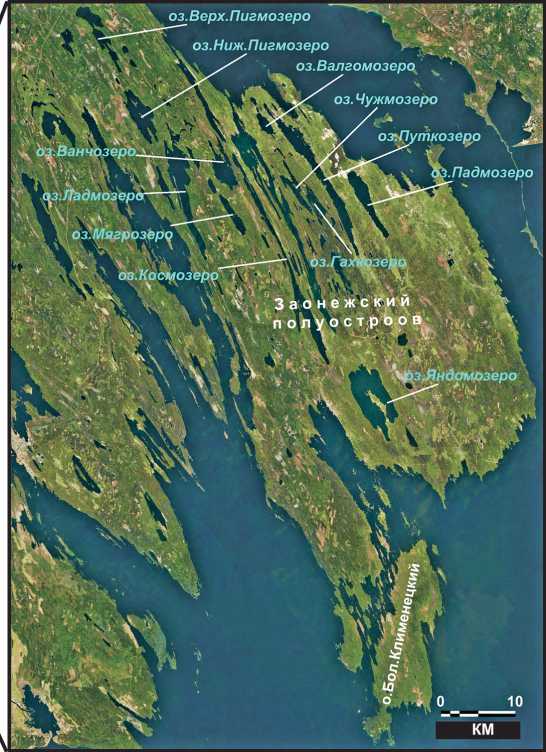 Онежского (Онежского) палеопротерозойского (2.5— 1.65 млрд лет) синклинория, залегающего на архейском (3.5—2.7 млрд лет) гранитогнейсовом фундаменте (Палеолимнология…, 2022). Для Заонежского полуострова характерна система складчато-разрывных нарушений северо-западного простирания, определяющая особенности его рельефа. Геоморфологические особенности территории определили преобладание аккумулятивного ледникового и водно-аккумулятивного рельефа на юго-востоке полуострова и денудационно-тектонического грядового (сельгового) рельефа на северо-западе (Демидов, 2005; Сельговые…, 2013). Современная гидрографическая сеть Заонежья начала формироваться в позднеледниковье (около 14 000 лет назад) по мере освобождения территории ото льда, образования и дальнейшего развития Онежского приледникового озера (Zobkov et al., 2019). Окончательно она оформилась только в голоцене (Палеолимнология…, 2022).