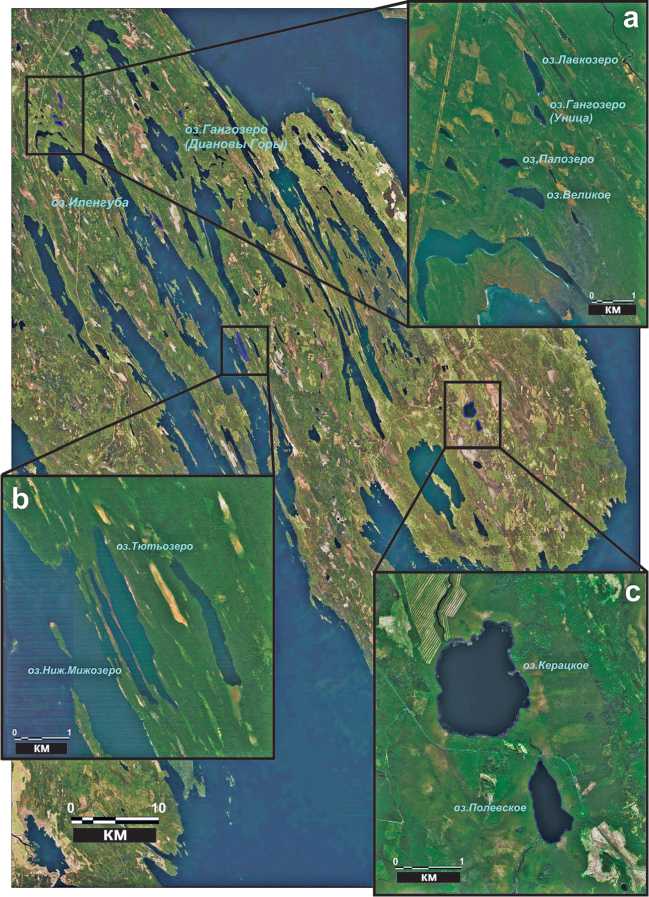 Изученные озёра расположены в различных частях Заонежья и образуют три группы (рис. 2). Первая группа находится на северо-западе района и включает Лавкозеро, Гангозеро (Уница), Палозеро и Великое (рис. 2, a), а также примыкающее к ним оз. Гангозеро (Диановы Горы). Вторая группа расположена в центре и включает Ниж. Мижозеро и Тютьозеро (рис. 2, b), а также оз. Иленгуба. Третья группа находится на юго-востоке и включает Полевское и Керацкое озёра (рис. 2, c). Все исследованные водоёмы относятся к озеркам, малым и очень малым озерам (Иванов, 1948), отличаются разнообразием морфометрических характеристик и показателей (табл. 1).