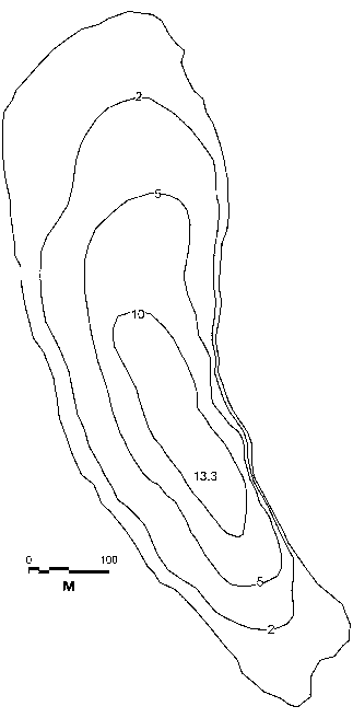 Гангозеро (Диановы Горы) находится на абсолютной отметке 81.0 м, характеризуется овально-серповидной удлиненной формой (рис. 3), вытянутой в субмеридиональном направлении ( Kl = 4.4). Озёрная котловина хорошо выражена, конусообразной формы ( Kh = 0.31), занимает межгрядовое понижение, глубины достигают 13.3 м (табл. 1). Западный и восточный берега высокие (восточный — каменистый, сбросового типа), северный и южный — низкие (северный берег заболочен). Озеро отличается отсутствием видимого поверхностного стока.