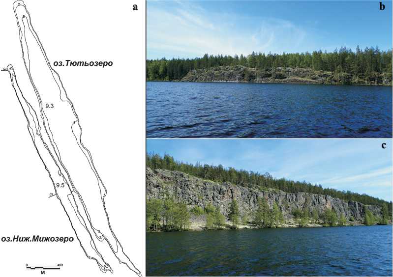 ты в виде борозды ( Kl 22.9 и 14.3 соответственно) в северо-северо-западном направлении (рис. 4). Берега высокие, каменистые, сбросового типа (рис. 4, b, c). Озерные котловины полуэллипсоидной формы ( Kh ~ 0.60), глубины достигают 9.3 и 9.5 м (табл. 1). Из оз. Тютьозеро вытекает ручей в оз. Ниж. Мижозеро, которое соединяется с Уницкой губой протокой и искусственным каналом.