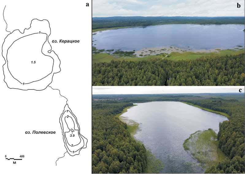 Рис. 5. Оз. Керацкое и Полевское: a — схема глубин; b — вид на котловину оз. Керацкое; c — вид на котловину оз. Полевское