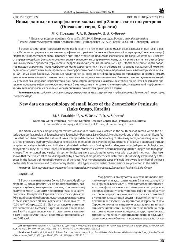В статье рассмотрены морфологические особенности не изученных ранее малых озёр, расположенных на юго-востоке Карелии в пределах историко-географического района Заонежье (Заонежский полуостров, Онежское озеро). Морфология представляет собой наиболее значимое отражение процессов формирования озёрных котловин и является определяющей для функционирования водных экосистем на современном этапе, т. к. напрямую влияет на разнообразные лимнические процессы (термические, гидрохимические, седиментационные и др.). Морфологические черты водоёмов находят выражение через морфометрические характеристики и вычисляемые на их основе показатели. В ходе экспедиционных работ нами были проведены геоморфологическое обследование береговой зоны и батиметрическая съёмка 10 малых озёр Заонежья. Основные характеристики озер идентифицировались по топокартам и космоснимкам, показатели вычислялись в соответствии с принятыми методическими указаниями. Показано, что исследованные водоёмы отличает разнообразие морфометрических параметров, которое в значительной степени объясняется различием протекания процессов озёрного морфолитогенеза. С учетом данных по ранее изученным озёрам выделено 4 морфогенетических типа водоёмов, их основные характеристики и показатели приводятся в статье.