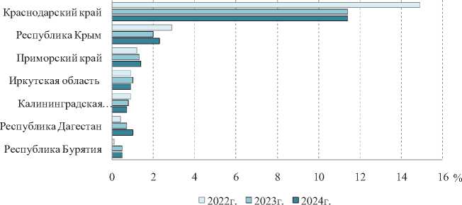 Fig. 1. The share of tourist flow in the regions participating the project “Five Seas and Lake Baikal” in relation to the total number of trips to the Russian Federation (for 2022–2024)