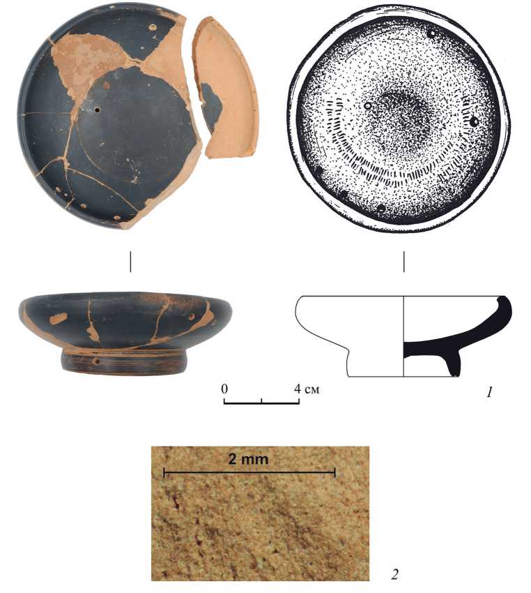1 – фрагментированная чернолаковая миска из кургана 11 могильника Колбино-I; 2 – макросъемка скола миски желобок на подошве, на внешней поверхности дна – небольшой конический выступ. Размеры: Dв. – 11см; Dпод. – 6 см; H – 4,2 см. Глина розово-бежевая (рис. 2: 2. Munsell: 7.5YR 6/4), хорошо отмученная, без видимых включений. Лак черный, чуть блестящий, тонким неровным слоем покрывает весь сосуд, за исключением ленты на стыке стенки и поддона, а также подошвы поддона. Внутреннюю поверхность украшает штампованный орнамент в виде двух–трех рядов насечек. Типологически близкие миски производились в Аттике со второй четверти и до конца IV в. до н. э. (Sparkеs, Talcott, 1970. P. 295–296: 828–839). Однако по ряду деталей, таких как отсутствие декора из лаковых концентрических кругов на внешней поверхности дна, наличие подвертикального гладкого поддона в сочетании с характерным утолщением стенок, этот сосуд стоит отнести к середине – третьей четверти IV в. до н. э.