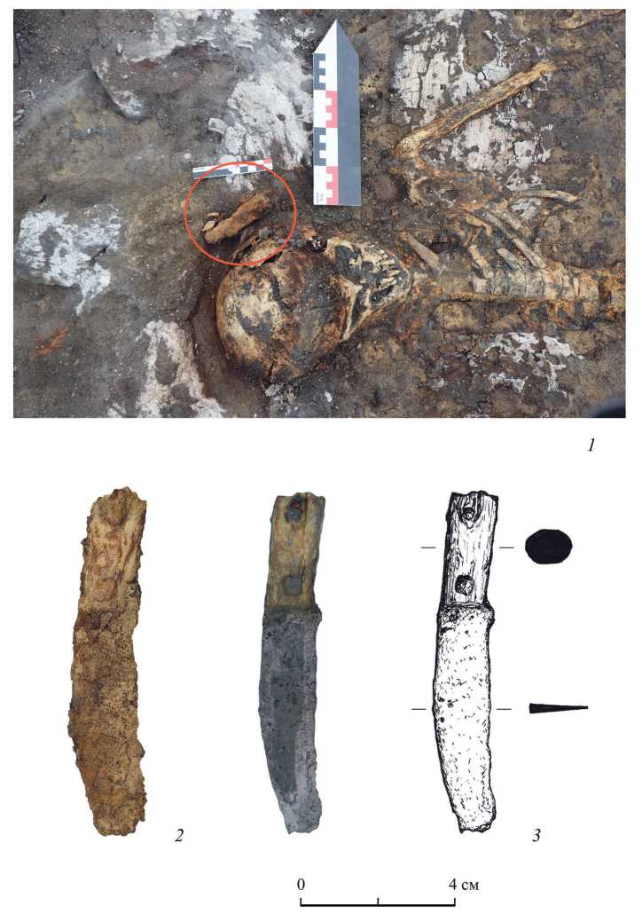 1 – фиксация железного ножа, обернутого в ткань, после снятия металлических деталей парадного головного убора индивида 1 (находка обведена красным кругом); 2 – до реставрации; 3 – после реставрации и удаления фрагментов ткани старым, с сильно сработанным лезвием, обломанным как со стороны клинковой части, так и со стороны рукояти, которая была сильно потерта от длительного использования (судя по его состоянию, явно не один-два года). При этом ножик, несмотря на состояние, был заботливо обернут несколькими слоями ткани (рис. 3: 2)6. Данное наблюдение свидетельствует о том, что скифскому населению, при всей пышности и помпезности погребальной обрядности, не была чужда практичность. Она позволяла им при соблюдении традиций захоронения порой использовать не только новые и хорошие вещи, которые могли бы пригодиться в мире живых, но и побывавшие в длительном употреблении (рис. 3: 3).