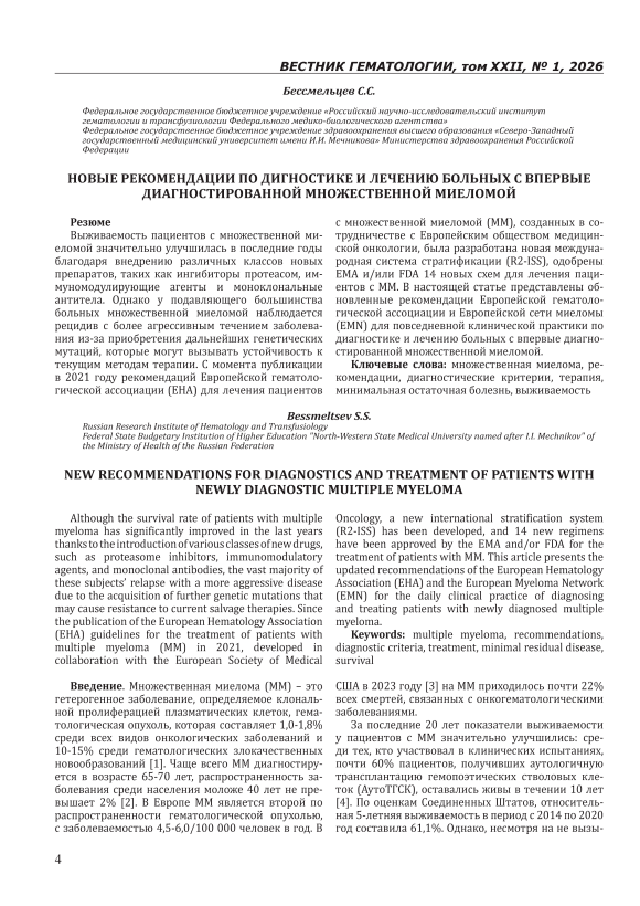 Выживаемость пациентов с множественной миеломой значительно улучшилась в последние годы благодаря внедрению различных классов новых препаратов, таких как ингибиторы протеасом, иммуномодулирующие агенты и моноклональные антитела. Однако у подавляющего большинства больных множественной миеломой наблюдается рецидив с более агрессивным течением заболевания из-за приобретения дальнейших генетических мутаций, которые могут вызывать устойчивость к текущим методам терапии. С момента публикации в 2021 году рекомендаций Европейской гематологической ассоциации (EHA) для лечения пациентов с множественной миеломой (MM), созданных в сотрудничестве с Европейским обществом медицинской онкологии, была разработана новая международная система стратификации (R2-ISS), одобрены EMA и/или FDA 14 новых схем для лечения пациентов с ММ. В настоящей статье представлены обновленные рекомендации Европейской гематологической ассоциации и Европейской сети миеломы (EMN) для повседневной клинической практики по диагностике и лечению больных с впервые диагностированной множественной миеломой.