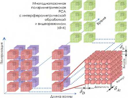 Одновременное использование совокупности методов и способов локации неизбежно приводит к многомерности получаемых данных, что обуславливает возможность получения принципиально новых характеристик подстилающей поверхности и объектов на ней. Поскольку речь идет о многомерных радиолокационных данных, целесообразно оценить их потенциально возможную размерность. В работе предлагается использовать так называемый куб данных (data cube), применяемый для хранения, визуализации и анализа мульти-и гиперспектральных данных [11]. Такой подход позволяет в несколько раз снизить время анализа за счет оптимизации запросов к памяти вычислительной системы [12]. В случае классической радиолокации рассматривается куб данных радиолокатора с фазированной антенной решеткой. В результате цифровой обработки сигналов получают двумерное РЛИ в координатах азимут – дальность. Для случая одновременного использования нескольких способов радиолокации в [13] предложена новая модель 6-мерного куба данных, сформированных с помощью многодиапазонной по-