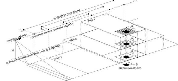 Геометрия синхронной радиолокационной съемки в режиме синтезирования апертуры в каждом из рассмотренных случаев является классической как для космических, так и для РСА воздушного базирования, в том числе с помощью комплексов с беспилотными летательными аппаратами. Безусловно, принцип формирования изображений существенно зависит от используемых режимов работы РСА – например, полосового или телескопического обзора. В самом общем случае принцип формирования радиолокационных изображений с помощью МД РСА в режиме полосового обзора представлен на рис. 3.