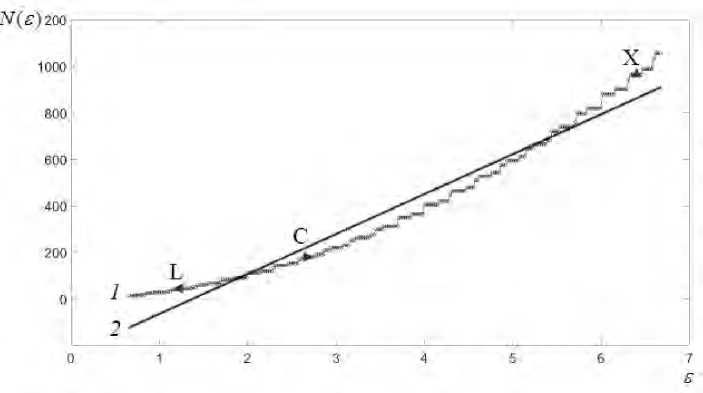 то разрешающая способность РСА – не что иное, как масштаб анализа s . Значение ФР будет определяться тангенсом угла наклона аппроксимирующей линии 2 . Исходя из этого, можно утверждать, что чем ближе к аппроксимирующей функции реальные значения, тем точнее можно определить фрактальную размерность. Если в соответствии с расчетной выборкой N ( s ) определить площадь объекта в зависимости от масштаба, то график зависимости площади от масштаба анализа s будет иметь зигзагообразный вид (кривая 1 ), представленный на рис. 5.