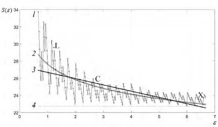 S (5) = k 5-D, (5) при использовании этой степенной функции в качестве аппроксимирующей получаем кривую 2, которая, в отличие от линейной 3, хорошо описывает расчетную и реальную зависимости, приближаясь к реальному значению 4. С помощью модели нелинейной регрессии определены k = 27,658, D = 0,098119. Полученная степенная зависимость подтверждает возможность применения математического аппарата фрактальной теории для ком-плексирования многодиапазонных РЛИ. Кроме того, таким способом можно обосновать выбор разрешающей способности каждого канала МД РСА.