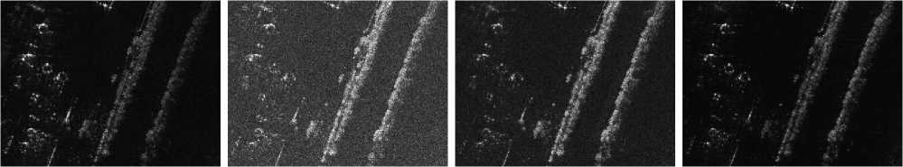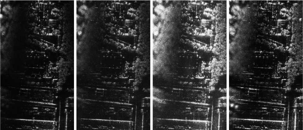Fig. 6. Initial radar images of five channels of multi-band SAR ( a - e ) and the result of fusion q = 1 f ), q = 2 ( g ), q = 3 ( h )