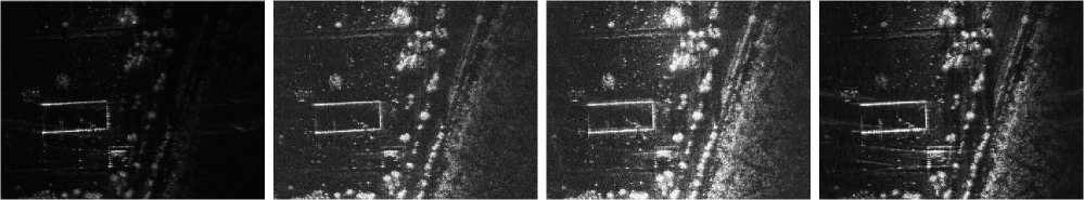 Участок сцены, соответствующий базовому изображению, согласно рис. 3, вырезается на остальных изображениях относительно середины интервалов накопления зондирующих сигналов Tcn (фазовых центров синтезированной апертуры антенн). Поскольку для обеспечения одинаковой дальности обнаружения в каждом частотном канале РСА требуется различная мощность излучения, а также в случае различной чувствительности приемников РСА требуется предварительное выравнивание динамического диапазона РЛИ. С учетом вычисленных согласно выражению (6) масштабов каждого РЛИ s n их динамический диапазон может быть выравнен, например, согласно выражению