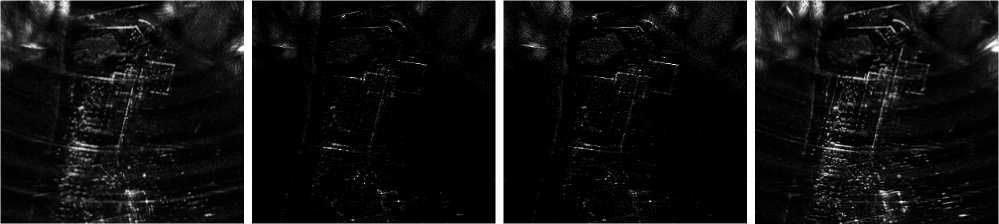 Как видно из рис. 10, мультифрактальные изображения («карты») всех поляриметрических РЛИ являются универсальным форматом представления радиолокационных данных. Возможность выявления и параметризации текстур РЛИ с учетом их анизотропии, а также очевидное сохранение и усиление энергетических характеристик точечных отражателей на РЛИ позволяют сделать вывод о потенциально высокой степени дифференциации классов однородных участков РЛИ и радиолокационных портретов для автоматизации дальнейшего успешного решения специфических задач сегментации (классификации) подстилающей поверхности, обнаружения и распознавания наземных объектов.