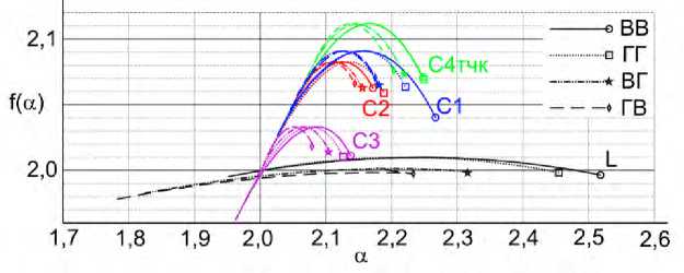 Причем РЛИ С4тчк (рис. 8, г ) фактически не является текстурным, поскольку на нем только точечные отражатели. На рис. 9 представлены муль-тифрактальные спектры, рассчитанные по всем поляриметрическим РЛИ из рис. 8.