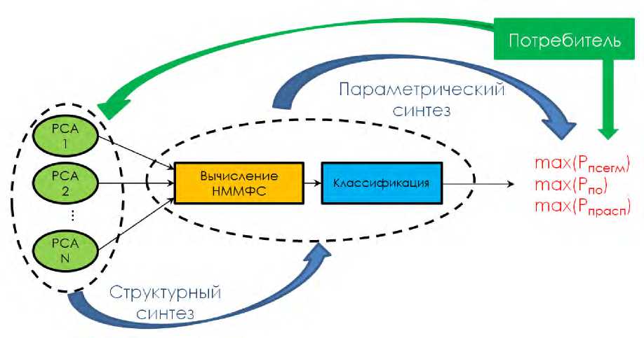 Так, согласно приведенной схеме, потребитель тематической информации сначала определяет целевую функцию – классификацию (сегментацию) подстилающей поверхности, обнаружение или распознавание объектов, определяемые требованиями к соответствующим вероятностям. На этой основе автоматически формируется состав «сенсоров» и структура вычислительной системы (структурный синтез), затем определяются параметры вычислителя, обеспечивающие максимальные значения характеристик.