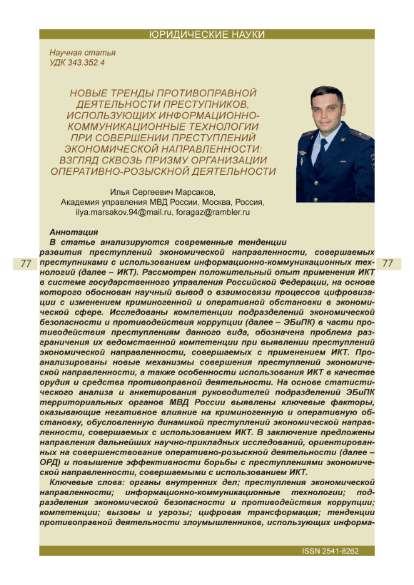 Органы внутренних дел, преступления экономической направленности, информационно-коммуникационные технологии, подразделения экономической безопасности и противодействия коррупции, компетенции, вызовы и угрозы, цифровая трансформация, тенденции противоправной деятельности злоумышленников, использующих информационно-коммуникационные технологии при совершении преступлений экономической направленности