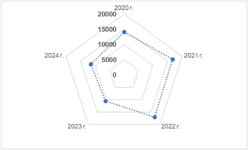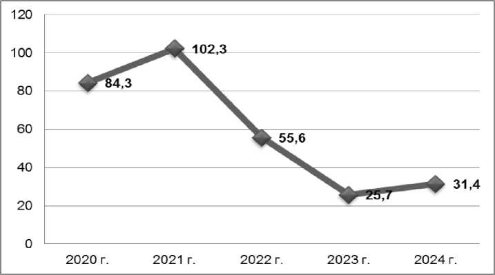 Инвестиции в основной капитал региона по виду экономической деятельности «Сельское, лесное хозяйство, охота, рыболовство и рыбоводство» в динамике снижаются (рис. 5). Сокращение объема инвестиций в основной капитал в 2024 г. по сравнению с 2020 г. также произошло и в зерновой отрасли региона.
