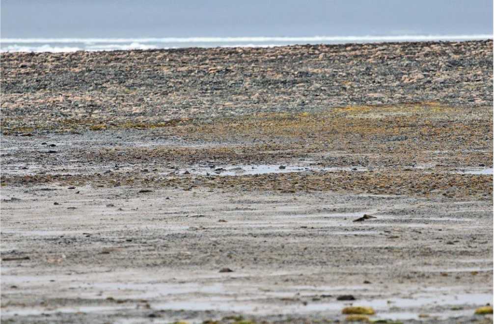 Турухтан Philomachus pugnax . Два турухтана (взрослый самец в осенне-зимнем наряде и молодая особь) зарегистрированы 21 августа 2018 на мысе Зуб на северо-восточной оконечности острова Большевик. Они кормились в зоне заплеска на каменистой литорали (рис. 3) неподалёку от озерка, где кормились тулесы. Все кулики улетели после того, как были вспугнуты наблюдателем.