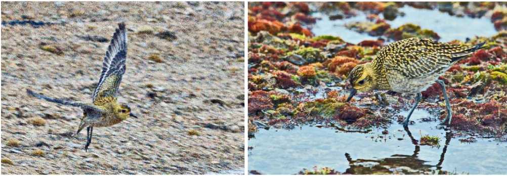 Бурокрылая ржанка Pluvialis fulva . Стайка из 20 ржанок пролетела низко вдоль восточного берега острова Голомянный 3 сентября 2020. В том же районе несколько часов спустя одиночная ржанка (рис. 2) кормилась в низинке на небольшой травяно-моховой дернине. Здесь было отмечено скопление свежего помёта чёрной казарки Branta bernicla и более крупного гуся, очевидно, гуменника Anser fabalis (в предыдущий год помёт крупного гуся наблюдался на острове Октябрьской Революции, а сама птица, определённая как гуменник, отмечена на Краснофлотских островах (Гаврило и др. 2025).