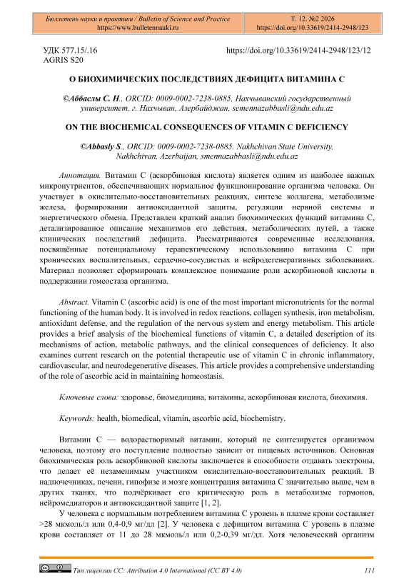 Витамин C (аскорбиновая кислота) является одним из наиболее важных микронутриентов, обеспечивающих нормальное функционирование организма человека. Он участвует в окислительно-восстановительных реакциях, синтезе коллагена, метаболизме железа, формировании антиоксидантной защиты, регуляции нервной системы и энергетического обмена. Представлен краткий анализ биохимических функций витамина C, детализированное описание механизмов его действия, метаболических путей, а также клинических последствий дефицита. Рассматриваются современные исследования, посвящённые потенциальному терапевтическому использованию витамина C при хронических воспалительных, сердечно-сосудистых и нейродегенеративных заболеваниях. Материал позволяет сформировать комплексное понимание роли аскорбиновой кислоты в поддержании гомеостаза организма.