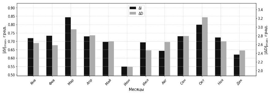 Рис. 2. Сезонная вариация среднемаксимальных значений ΔI и ΔD