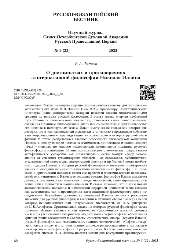 Статья посвящена недавно скончавшемуся ученому, доктору физикоматематических наук Н. П. Ильину (1947–2023), профессору Политехнического института (ныне университета), который известен своими многочисленными трудами по истории русской философии. В статье кратко очерчен необычный путь Ильина к философскому творчеству; отмечается связь самостоятельного овладения Ильиным философскими знаниями со смелостью и оригинальностью его подхода к исследуемым темам. Ильин выступал не только как историк философии, но и как независимый мыслитель с отчетливо выраженным собственным мировоззрением, претендующим на новое слово в истории русской метафизики. В статье раскрываются главные особенности философской концепции Ильина, в основу которой положена взаимосвязь личностного и национального начал — главных, по мнению исследователя, компонентов подлинно русского философского мышления. Ильин принципиально отмежевывает рациональнометафизическое умозрение как независимую и особо важную сферу самосознания от смежных гуманитарных областей — от богословия, публицистики, художественной литературы, литературной критики и пр. Узловой центр необычного подхода Ильина к истории русской философии — тотальное опровержение учения о «всеединстве» самого известного отечественного философа В. С. Соловьева и критический подход к идеям его предтеч и многочисленных последователей или «эпигонов». В качестве ведущих русских философов Ильин выдвигает других, в основном мало известных прежде мыслителей, акцентировавших значение начал личности и национальности. В статье показано, что с этим новым аксиологическим подходом и измененной иерархией ценностей тесно связаны как достоинства, так и противоречия альтернативного философского кредо исследователя. Важнейшее достоинство сочинений Ильина состоит в раскрытии значения для русской философии и введении в научный оборот наследия целой когорты недооцененных или полузабытых мыслителей, от А. А. Григорьева до П. Е. Астафьева. Оригинальный взгляд на историю русской философии также позволил Ильину выявить в ней множество «фантомных» понятий, ложных идей и преувеличенных авторитетов. Убедительны его философские обоснования критики таких восходящих к Соловьеву «гностических химер» (термин Ильина) русской философии, как «всеединство», «единое человечество», «Cофия», «теургия», «душа мира» и т. п., получивших широкое распространение в так называемой «религиозной философии» Серебряного века. В статье показано, что в философской системе Н. П. Ильина имеется целый ряд внутренних противоречий. Хотя самобытный историк русской философской мысли и отдавал явное предпочтение рациональнологическому и метафизическому способу мышления, он часто склоняется к эмоциональной, публицистической манере изложения. Преобладающий в сочинениях Ильина критический пафос носит порой излишне категоричный и не вполне объективный характер. В статье, в частности, отмечается, что Ильин подвергает резкой и во многом необоснованной критике славянофилов (за исключением И. В. Киреевского), рассматривая их как заурядных предтеч Вл. Соловьева. При всей верности раскрытия ряда действительных недостатков славянофильства, увлеченный своими идеями Ильин в полемическом азарте нередко теряет чувство меры. Отсюда огульное и пот