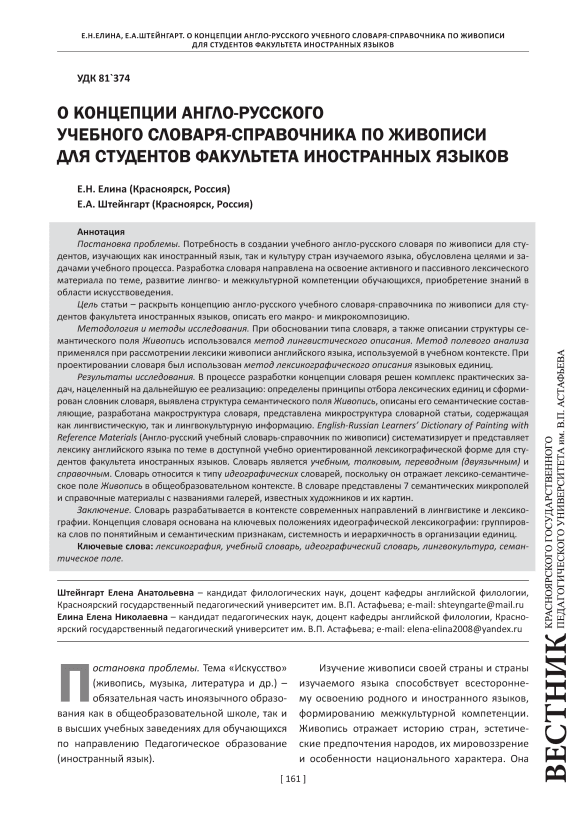 Постановка проблемы. Потребность в создании учебного англо-русского словаря по живописи для студентов, изучающих как иностранный язык, так и культуру стран изучаемого языка, обусловлена целями и задачами учебного процесса. Разработка словаря направлена на освоение активного и пассивного лексического материала по теме, развитие лингво- и межкультурной компетенции обучающихся, приобретение знаний в области искусствоведения. Цель статьи – раскрыть концепцию англо-русского учебного словаря-справочника по живописи для студентов факультета иностранных языков, описать его макро- и микрокомпозицию. Методология и методы исследования. При обосновании типа словаря, а также описании структуры семантического поля Живопись использовался метод лингвистического описания. Метод полевого анализа применялся при рассмотрении лексики живописи английского языка, используемой в учебном контексте. При проектировании словаря был использован метод лексикографического описания языковых единиц. Результаты исследования. В процессе разработки концепции словаря решен комплекс практических задач, нацеленный на дальнейшую ее реализацию: определены принципы отбора лексических единиц и сформирован словник словаря, выявлена структура семантического поля Живопись, описаны его семантические составляющие, разработана макроструктура словаря, представлена микроструктура словарной статьи, содержащая как лингвистическую, так и лингвокультурную информацию. English-Russian Learners’ Dictionary of Painting with Reference Materials (Англо-русский учебный словарь-справочник по живописи) систематизирует и представляет лексику английского языка по теме в доступной учебно ориентированной лексикографической форме для студентов факультета иностранных языков. Словарь является учебным, толковым, переводным (двуязычным) и справочным. Словарь относится к типу идеографических словарей, поскольку он отражает лексико-семантическое поле Живопись в общеобразовательном контексте. В словаре представлены 7 семантических микрополей и справочные материалы с названиями галерей, известных художников и их картин. Заключение. Словарь разрабатывается в контексте современных направлений в лингвистике и лексикографии. Концепция словаря основана на ключевых положениях идеографической лексикографии: группировка слов по понятийным и семантическим признакам, системность и иерархичность в организации единиц.