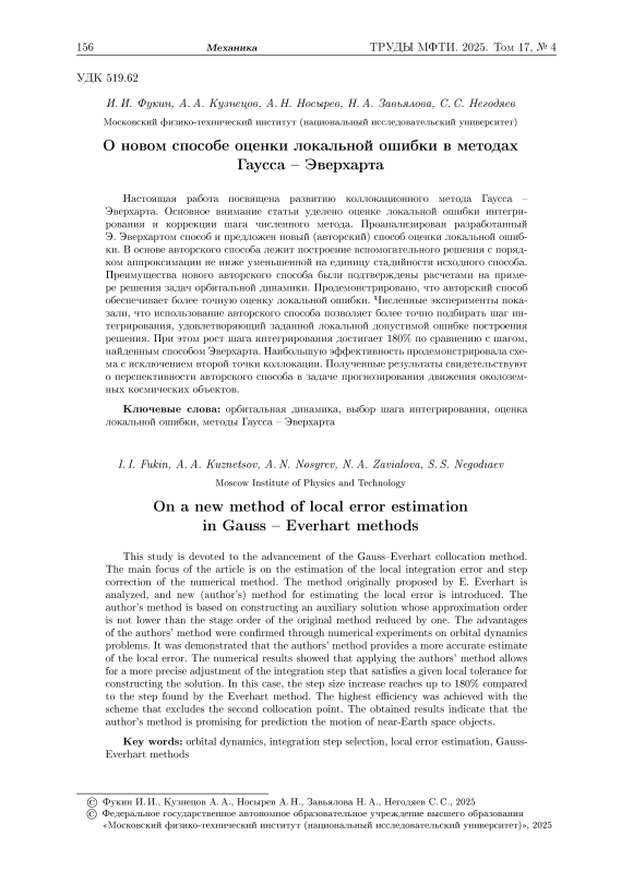Настоящая работа посвящена развитию коллокационного метода Гаусса – Эверхарта. Основное внимание статьи уделено оценке локальной ошибки интегрирования и коррекции шага численного метода. Проанализирован разработанный Э. Эверхартом способ и предложен новый (авторский) способ оценки локальной ошибки. В основе авторского способа лежит построение вспомогательного решения с порядком аппроксимации не ниже уменьшенной на единицу стадийности исходного способа. Преимущества нового авторского способа были подтверждены расчетами на примере решения задач орбитальной динамики. Продемонстрировано, что авторский способ обеспечивает более точную оценку локальной ошибки. Численные эксперименты показали, что использование авторского способа позволяет более точно подбирать шаг интегрирования, удовлетворяющий заданной локальной допустимой ошибке построения решения. При этом рост шага интегрирования достигает 180% по сравнению с шагом, найденным способом Эверхарта. Наибольшую эффективность продемонстрировала схема с исключением второй точки коллокации. Полученные результаты свидетельствуют о перспективности авторского способа в задаче прогнозирования движения околоземных космических объектов.