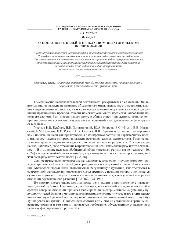 Анализируются проблемы целеполагания в прикладных педагогических исследованиях. Приведены типичные ошибки в постановке целей педагогических исследований. Рассматриваются возможные последствия некорректной формулировки. На основе представления цели как модели результата вырабатываются целевые критерии и особенности их объединения в формулировку цели прикладного диссертационного исследования.