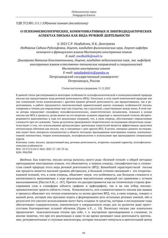 В данной статье рассматриваются некоторые особенности психофизиологической и коммуникативной природы письма как продуктивного вида речевой деятельности (ВРД). Поскольку в силу своей комплексной природы оно уже изначально тесно взаимосвязано с другими видами речевой деятельности, как продуктивными, так и рецептивными, в работе предлагается многоаспектный сравнительный анализ основных особенностей письма, говорения и чтения для определения черт как сходства, так и различий, существующим между ними. В этой связи авторы определяют специфику психофизиологических, кинестетических механизмов, лежащих в основе письма как ВРД и процесса, делая акцент на его вторичнокодовом характере и значительной степени абстрагированности выполняемых в ходе его реализации операций, что, в свою очередь, обусловливает определенные сложности при его освоении. Также результаты проведенного теоретического исследования убедительно свидетельствуют о том, что использование артикуляторнозрительных кинестезий является эффективным средством оптимизации обучения как письму, так и связанным с ним другим ВРД. В целом, материал данного исследования может быть интересен специалистам в области методики преподавания иностранных языков, коммуникативной лингвистики, теории коммуникации, психофизиологии и использован при преподавании специальных курсов.