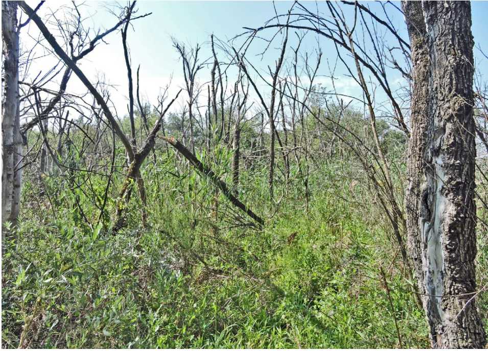 Рис. 3. Заросшая тростником протока между озёрами Тамбукан и Малый Тамбукан с погибшими из-за вымокания деревьями. 30 июля 2016. Фото автора