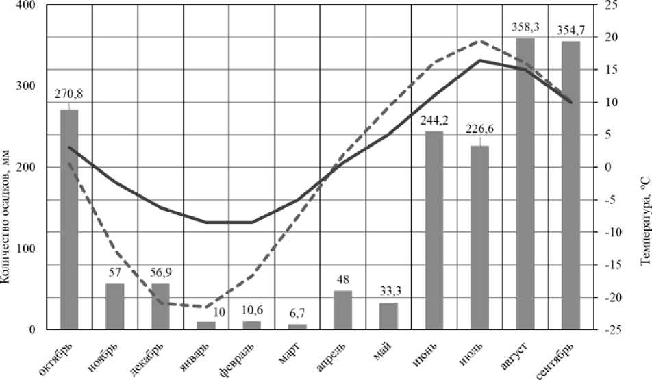 Рис. 2. Распределение осредненного количества осадков и показателей температуры по месяцам по измерениям на территории Зейского заповедника (2016–2025 гг.)