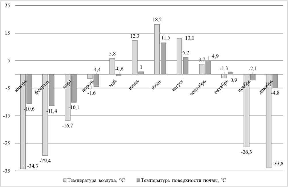 Fig. 3. Distribution of monthly average temperature values by measurements in the Tokinsko-Stanovoi National Park ведущей от БАМа через Становой хребет к Эль-гинскому угольному месторождению на юге Якутии, и освоение месторождений полезных ископаемых в истоках р. Мая (район слияния рр. Аюмкан и Кунь-Маньё). Территория доступна для высокопроходимой техники и вертолётов. Уже сейчас ключевые места обитания снежного барана, дикуши, дикого северного оленя становятся объектами охоты с вездеходов и вертолётов.