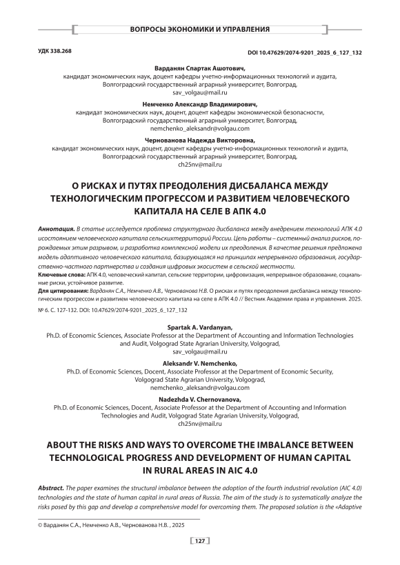 The paper examines the structural imbalance between the adoption of the fourth industrial revolution (AIC 4.0) technologies and the state of human capital in rural areas of Russia. The aim of the study is to systematically analyze the risks posed by this gap and develop a comprehensive model for overcoming them. The proposed solution is the «Adaptive Human Capital» model, based on the principles of continuous education, public-private partnerships, and the creation of digital ecosystems in rural areas.