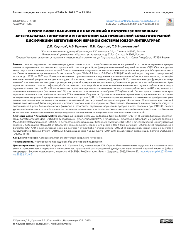 Цель исследования: систематизация данных литературы о роли биомеханических нарушений в патогенезе первичных артериальных гипертензии и гипотензии как проявлений соматоформной дисфункции вегетативной нервной системы (СДВНС) по кардиальному типу, а также анализ доказательной базы применения мануальных остеопатических методов в их коррекции. Материалы и методы. Поиск источников проводился в базах данных Scopus, Web of Science, PubMed и РИНЦ (Российский индекс научного цитирования) за период с 1991 по 2025 год. Критерии включения: оригинальные исследования, систематические обзоры и метаанализы, посвящённые вегетативной регуляции сердечно-сосудистой системы, соматоформным дисфункциям ВНС, соматическим дисфункциям и мануальным/остеопатическим методам коррекции нарушений артериального давления; публикации на русском и английском языках. Критерии исключения: тезисы конференций без полнотекстовых версий, описания единичных клинических случаев, публикации с недоступным полным текстом. Из 412 первоначально идентифицированных источников после удаления дубликатов (n=89) и скрининга по заголовкам и аннотациям (исключено n=156) для полнотекстового анализа отобрано 167 публикаций. После оценки соответствия критериям включения в итоговый анализ вошли 135 источников. Результаты. Проанализированы современные представления о патогенезе первичных нарушений артериального давления в структуре СДВНС. Систематизированы данные о соматических дисфункциях различных анатомических регионов и их связи с вегетативной дисрегуляцией сердечно-сосудистой системы. Представлен критический анализ доказательной базы мануальных и остеопатических методов коррекции. Заключение. Имеющиеся данные свидетельствуют о потенциальной роли биомеханических факторов в патогенезе первичных нарушений артериального давления при СДВНС, однако уровень доказательности для большинства описанных механизмов и терапевтических подходов остаётся недостаточным. Необходимы качественные рандомизированные контролируемые исследования для верификации теоретических концепций.