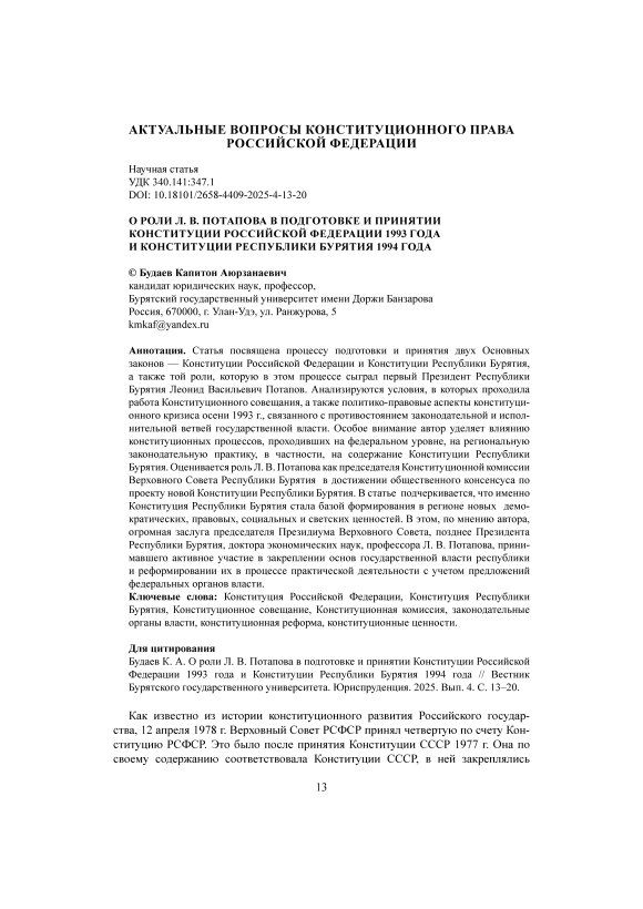 Статья посвящена процессу подготовки и принятия двух Основных законов — Конституции Российской Федерации и Конституции Республики Бурятия, а также той роли, которую в этом процессе сыграл первый Президент Республики Бурятия Леонид Васильевич Потапов. Анализируются условия, в которых проходила работа Конституционного совещания, а также политико-правовые аспекты конституционного кризиса осени 1993 г., связанного с противостоянием законодательной и испол- нительной ветвей государственной власти. Особое внимание автор уделяет влиянию конституционных процессов, проходивших на федеральном уровне, на региональную законодательную практику, в частности, на содержание Конституции Республики Бурятия. Оценивается роль Л. В. Потапова как председателя Конституционной комиссии Верховного Совета Республики Бурятия в достижении общественного консенсуса по проекту новой Конституции Республики Бурятия. В статье подчеркивается, что именно Конституция Республики Бурятия стала базой формирования в регионе новых демократических, правовых, социальных и светских ценностей. В этом, по мнению автора, огромная заслуга председателя Президиума Верховного Совета, позднее Президента Республики Бурятия, доктора экономических наук, профессора Л. В. Потапова, принимавшего активное участие в закреплении основ государственной власти республики и реформировании их в процессе практической деятельности с учетом предложений федеральных органов власти.