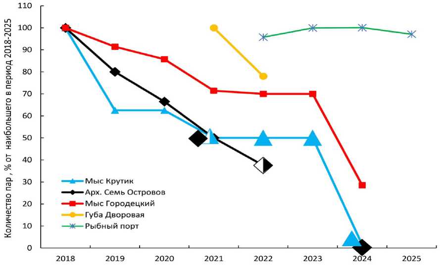 Проводилось визуальное обследование гнездовых поселений моевок в Кольском заливе и на острове Кильдин. Использовалась фоторегистрация всей площади колонии с последующим анализом фотоснимков. В синантропной колонии, расположенной в рыбном порту Мурманска, в 2022 году были определены количество пар и продуктивность размножения в конце гнездового сезона (Горяева, Горяев 2024). В 2023-2025 годах здесь же определялись заселённость, средняя величина кладки, продуктивность. Во второй колонии, расположенной на острове Кильдин и впервые описанной в 2024 году, в период окончания насиживания и начала вылупления определены общая численность гнездовых пар, заселённость, а также некоторые характерные для этого периода элементы поведения птиц. Полученные данные сравнивались с показателями в ранее наблюдавшихся колониях. Для удобства иллюстрации нами взят период 2018-2025 годов (рис. 2).