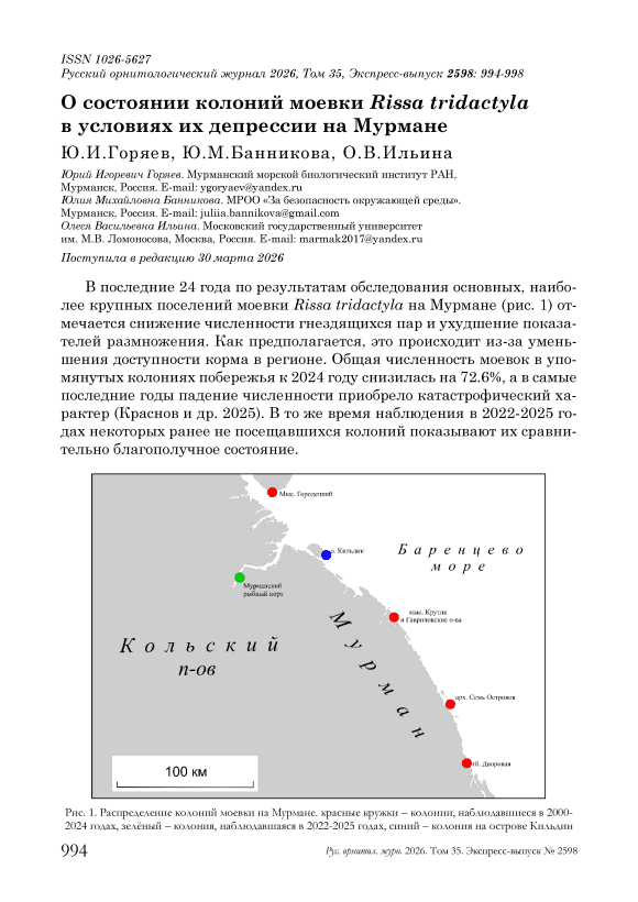 В последние 24 года по результатам обследования основных, наиболее крупных поселений моевки Rissa tridactyla на Мурмане (рис. 1) отмечается снижение численности гнездящихся пар и ухудшение показателей размножения. Как предполагается, это происходит из-за уменьшения доступности корма в регионе. Общая численность моевок в упомянутых колониях побережья к 2024 году снизилась на 72.6%, а в самые последние годы падение численности приобрело катастрофический характер (Краснов и др. 2025). В то же время наблюдения в 2022-2025 годах некоторых ранее не посещавшихся колоний показывают их сравнительно благополучное состояние.