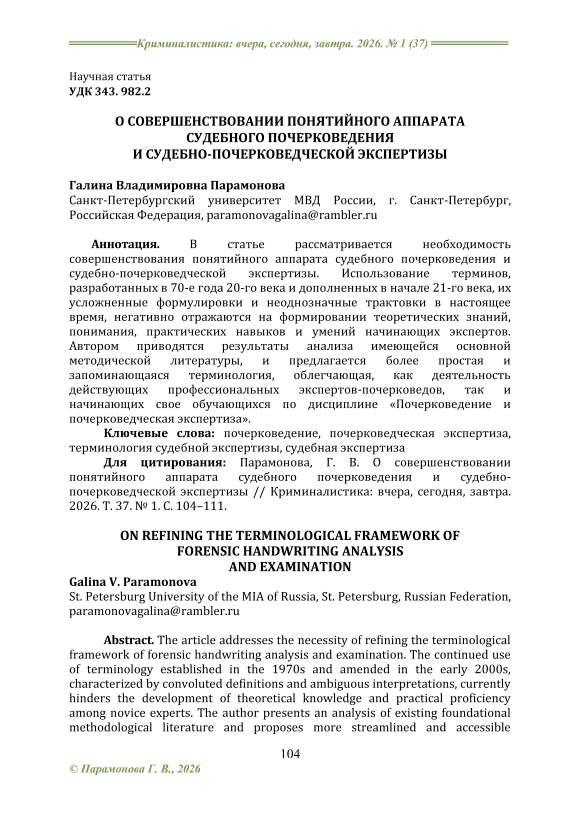 В статье рассматривается необходимость совершенствования понятийного аппарата судебного почерковедения и судебно-почерковедческой экспертизы. Использование терминов, разработанных в 70-е года 20-го века и дополненных в начале 21-го века, их усложненные формулировки и неоднозначные трактовки в настоящее время, негативно отражаются на формировании теоретических знаний, понимания, практических навыков и умений начинающих экспертов. Автором приводятся результаты анализа имеющейся основной методической литературы, и предлагается более простая и запоминающаяся терминология, облегчающая, как деятельность действующих профессиональных экспертов-почерковедов, так и начинающих свое обучающихся по дисциплине «Почерковедение и почерковедческая экспертиза».