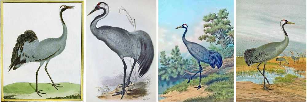 Рис. 2. Цветные рисунки серого журавля в старинных альбомах Слева направо: Martinet (1776); Gould (1837); Blaauw (1897); Hennicke (1899)