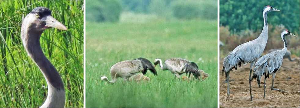 Рис. 3. Подвиды серого журавля Grus grus . Слева – G. g. archibaldi , Армения, фото М.Касабяна; в центре – G. g. cinerea , Германия, фото Н.Гюнтера; справа – G. g. grus , центр европейской части России, фото И.Барташова