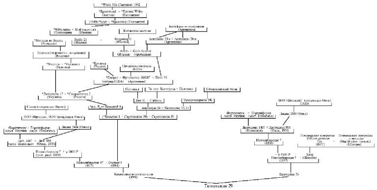 Родословная сорта мягкой яровой пшеницы ( Tríticum aestivum L.) Тюменская 29, созданного с использованием теоретически обоснованных технологий селекции и селекционного материала в рамках Межведомственной программы «ДИАС». Звездочкой отмечены озимые сорта (формы).